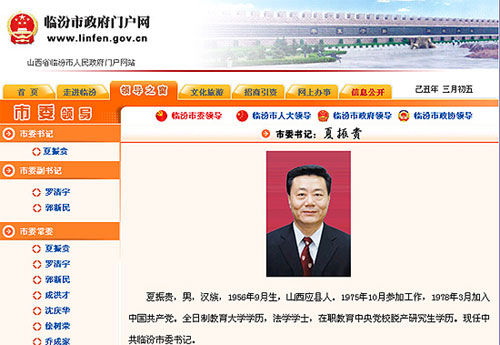針對(duì)近日網(wǎng)上流傳的山西臨汾“自潰壩事故以來(lái)半年無(wú)人任市委書記”、“兩會(huì)”至今尚未召開(kāi)”的信息,編輯上午瀏覽了“臨汾市政府門戶網(wǎng)”發(fā)現(xiàn):臨汾市政府網(wǎng)站仍顯示夏振貴現(xiàn)任臨汾市委書記,羅清宇則現(xiàn)任中共臨汾市委副書記、代市長(zhǎng)。