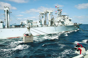 經(jīng)過9天9夜的航行,今天(注:11日)上午,海軍第二批護(hù)航編隊(duì)的“深圳”號導(dǎo)彈驅(qū)逐艦和“黃山”號導(dǎo)彈護(hù)衛(wèi)艦,在阿拉伯海與前出接應(yīng)的第一批護(hù)航編隊(duì)的“微山湖”號綜合補(bǔ)給艦會(huì)合,并實(shí)施了補(bǔ)給。
