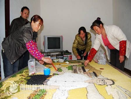 據(jù)介紹,整幅圖畫高一點八三米,寬三點零五米,以木板為底,畫面色彩搭配全部用當(dāng)?shù)厥a(chǎn)的玉米、黃豆、小豆、黑豆、蕎麥等二十多種雜糧拼貼。畫面內(nèi)容以山水環(huán)繞的棗樹村為背景,溫家寶總理居中,左右分別是棗樹村抗震救災(zāi)英雄石光華等村民。