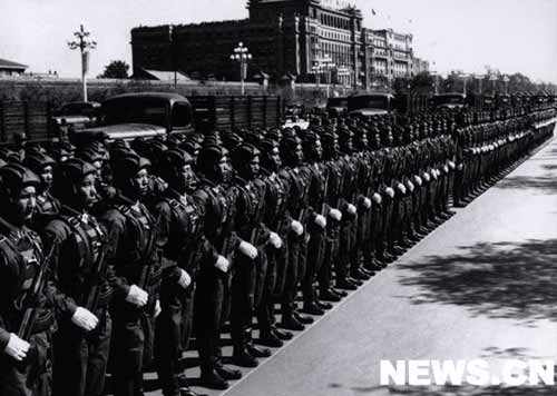 我們偉大祖國(guó)萬(wàn)里海疆的保衛(wèi)者--海軍軍官和水兵們列隊(duì)通過(guò)天安門(mén)廣場(chǎng)。他們當(dāng)中,有擊沉、擊傷敵艦船一百多艘、俘獲五十艘的東海艦隊(duì)水兵;還有來(lái)自福建前線的水兵,他們?cè)谌ツ昵锾斓膬蓚(gè)月里,曾把二十多艘蔣軍艦艇埋葬在臺(tái)灣海峽。我們祖國(guó)"有海無(wú)防"的時(shí)代一去不復(fù)返了。人民海軍已經(jīng)是一支擁有大量水面艦艇、水下潛艇和海軍航空兵、海岸炮兵等各兵種組成的堅(jiān)強(qiáng)的海防力量。