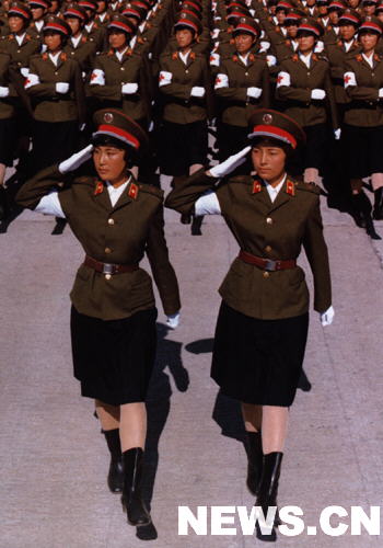 英姿颯爽的女衛生兵是建國以來第一次出現在閱兵序列中。第七排的排頭兵是朝鮮族女戰士康輝。1957年國慶節,她的父親參加了首都的閱兵式。現在,她又成為第一批受閱女兵的一員,真是幸福的兩代人。觀禮臺上,來自邊疆的少數民族觀禮代表們知道女衛生兵方隊中還有滿、蒙古、回、壯、彝、鄂溫克、達斡爾族姐妹,高興地向女兵方隊鼓掌、致意。