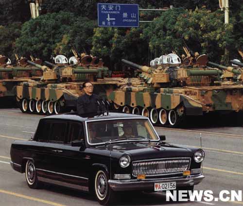 五十響禮炮的回聲還在廣場上空激蕩,紅旗牌檢閱車駛出天安門。中共中央總書記、中華人民共和國主席、中央軍委主席江澤民,身著中山裝,神采奕奕地站立在檢閱車的中央。