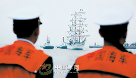彩旗在風(fēng)中飄揚(yáng),禮炮在空中響起。4月18日晚7時(shí)許,美麗的青島港迎來了參加中國(guó)海軍60周年慶典的第一位“客人”——墨西哥的“夸烏特莫克”號(hào)風(fēng)帆訓(xùn)練艦。慶祝中國(guó)海軍成立60周年多國(guó)海軍活動(dòng),由此拉開了帷幕。