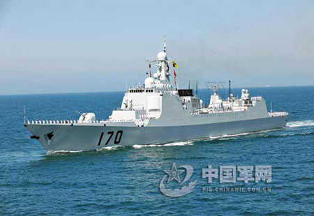 參加海上閱兵的新一代國產驅逐艦中,“蘭州”號導彈驅逐艦備受世人矚目。該艦舷號170,是中國目前最新型的導彈驅逐艦,在網上被譽為“中華神盾”。該艦2001年8月在上海江南造船廠開工建造,2003年4月下水,2005年8月出廠,2005年9月正式命名加入人民海軍序列。