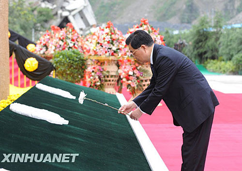 在向汶川特大地震遇難同胞和在抗震救災過程中英勇獻身的烈士們獻花籃、默哀,并舉行地震廢墟之上的升國旗、唱國歌儀式后,胡錦濤神情肅穆地走上講臺,發表汶川特大地震一周年紀念講話。