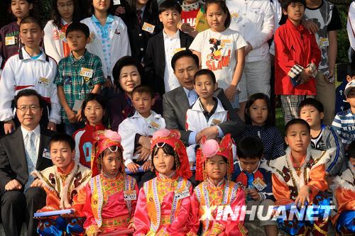 不一會兒,李明博總統攜夫人金潤玉一起走來,孩子們迎上前去。李明博一眼就認出了他在大地震發生后不久訪問四川時曾抱過的魏月濠小朋友。李明博撫摸著魏月濠的頭,親切地說:“長大了不少。”