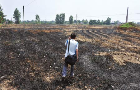 繼續(xù)往北行駛,在前方大約一公里處,一位農(nóng)夫正將一大堆秸稈點燃,燒秸稈的火苗足有半米多高,騰起的濃煙讓高速路上的車輛都放慢了速度。在點燃一堆秸稈后,這名農(nóng)夫又轉(zhuǎn)身到另一塊農(nóng)田里,點燃堆放在那兒的秸稈……