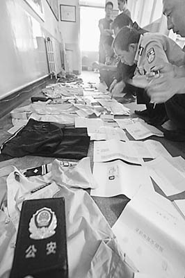 民警在搜查周某暫住在天平營村的住所時,查獲了偽造的內蒙古自治區公安廳廳長令、調函,警用人員報告書、成立派出所報告書、安置卡,購買了警服、警號、警銜、警官證和法律法規書和私刻的公章以及冒充自治區公安廳某領導簽署的調他任薛家灣公安局局長的調令等大量假證件。(本報記者 李玉波)