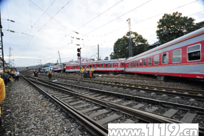 經偵查得知,此次列車相撞事故是由K9017次列車撞上了稍前脫軌的K9063列車,K9017次列車繼而撞上了旁邊民房。事故發生地為飛虹橋道口,現場約70人受傷,發現3人遇難。支隊全勤指揮部立即將參戰官兵分成2組,分別對2列相撞火車和民房被困人員展開救援,一組負責民房倒塌處的工作,一組負責相撞列車的救援工作。第一組官兵冒著民房再次塌方的危險,采用減擴器、撬棍、切割機、人工手挖等方式救出4人,挖掘出1具尸體。另一組官兵負責列車救援工作,因車廂嚴重扭曲變形,參戰官兵采用撬棍、起重氣墊、液壓撐頂器、千斤頂等工具撐開列車變形部分,戰士們冒著車廂隨時可能再次坍塌的危險為被困乘客打開生命通道。