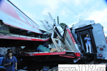 6月29日2時33分許,湖南公安消防總隊郴州市消防支隊指揮中心接到報警:飛虹橋道口兩列客運火車相撞(K9017次列車撞上了稍前脫軌的K9063次列車),其中一列撞上附近一民房,請求救援。