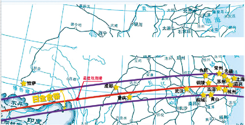 同時,這也是世界歷史上覆蓋人口最多的一次日全食。據中國國家天文臺預報稱,中國可觀測到這次日全食的地區包括西藏東南部、云南西北部、四川、重慶、湖北、湖南北部、安徽、江西北部、江蘇南部、浙江北部和上海。其中,武漢、銅陵、桐城、湖州、常州、無錫、蘇州、杭州、嘉興、紹興、上海、寧波、舟山13個城市位于日食帶內,適宜進行日全食觀測。全國其他區域也均能看到日偏食。據太陽移動軌跡,長江沿線一帶的居民都能大飽眼福。所以,世界天文學界甚至稱此次日食為“中國日全食”。