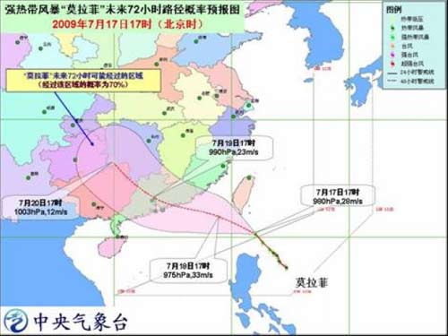 中新網7月17日電 中央氣象臺17日下午6時發布臺風橙色警報:今年第 6 號熱帶風暴“莫拉菲”( MOLAVE )于 17 日上午加強為強熱帶風暴,17日下午5時其中心位于臺灣恒春南偏東大約250公里的海面上,就是北緯20.2度、東經122.1度,中心附近最大風力有10級( 28 米 / 秒)。