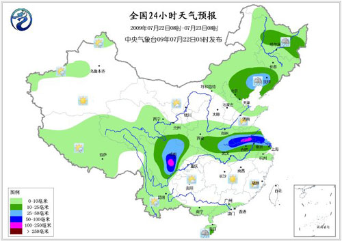 中新網(wǎng)7月22日電 中央氣象臺(tái)2009年7月22日06時(shí)發(fā)布未來三天天氣趨勢(shì)預(yù)報(bào)稱,江淮黃淮四川盆地江南北部等地有強(qiáng)降水,江南華南西南地區(qū)東部等地仍有高溫。
