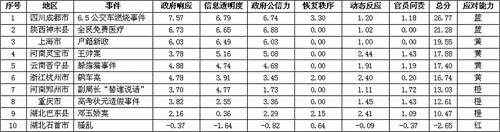 說明:本表數據為11位輿情分析師采用德爾菲法,對地方政府應對網絡輿情表現進行分項評估后得出。其中政府響應、信息透明度、政府公信力三項為常規指標,分值區域分別為-10~10分;恢復秩序、動態反應、官員問責三項為特殊指標,分值區域分別為-5~5分、-3~3分、-3~3分。輿情分析師依據以上各項指標對政府表現分別做出評價,政府表現越出色、應對越得體則得分越高,反之則得分越低。最終依據各項表現綜合所得總分,得出藍、黃、橙、紅四級警報級別,警報程度相應由低到高。其中總分20.00分以上為藍色警報,政府應對總體較為得體;總分15.00~19.99分為黃色警報,政府應對有待進一步加強;總分10.00~14.99為橙色警報,政府應對存在明顯問題;總分10.00分以下為紅色警報,政府應對嚴重失當,存在重大缺陷。