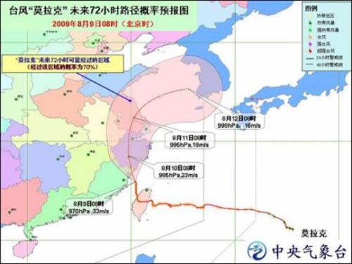 受其影響,今天中午到明天中午,臺灣以東洋面、東海大部海面、黃海南部、臺灣海峽、巴士海峽、巴林塘海峽、臺灣省及其沿海、福建北部和中部沿海、浙江沿海、長江口區、江蘇南部沿海將有7-10級大風,“ 莫拉克 ” 中心經過的附近海面或地區的風力有11-12級;臺灣大部、福建大部、浙江大部、上海、江西東北部、安徽東南部、江蘇南部有大到暴雨,其中,浙江東部、福建東北部、臺灣北部有大暴雨,局部地區有特大暴雨。