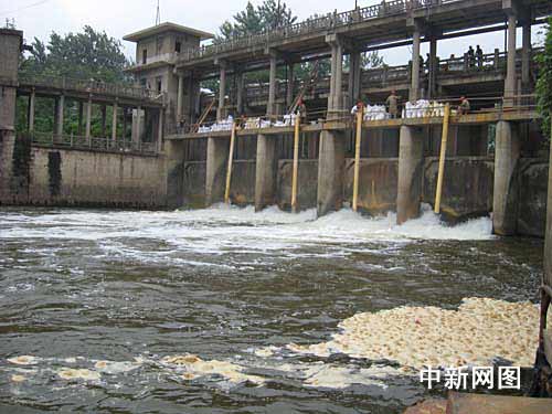 中新社徐州八月九日電 (邵國棟)記者今天來到受嚴重砷污染的江蘇省邳州市邳城鎮城河節制閘現場,十余名工人正在閘站上往河道里投放一種黃色的粉末。工人稱這種叫三氯化鐵的化學物質主要用來降低水體砷化物濃度,他們已經在此晝夜堅守多日。