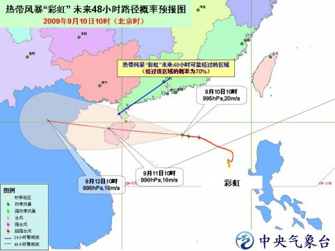 中新網(wǎng)9月10日電 中央氣象臺(tái)今日發(fā)布臺(tái)風(fēng)橙色警報(bào):今年第13號(hào)熱帶風(fēng)暴“彩虹”的中心今天上午10時(shí)位于海南省文昌市東偏南方向大約400公里的南海北部海面上,就是北緯19.0度、東經(jīng)114.7度,中心附近最大風(fēng)力有8級(jí)(20米/秒)。