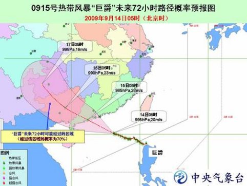 中新網(wǎng)9月14日電 中央氣象臺今日06時(shí)發(fā)布臺風(fēng)橙色警報(bào):今年第15號熱帶風(fēng)暴“巨爵”(Koppu ,名字來源于日本,指巨爵星座)的中心今天早晨 5 時(shí)位于廣東陽江東南方大約 480 公里的南海北部海面上,就是北緯20.1度、東經(jīng)116.2度,中心附近最大風(fēng)力有9級(23 米/秒)。