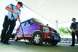 車子駛入檢查站后,絕大多數(shù)司機會立即遞出駕照、行駛本和身份證。如果車輛和人員沒有任何可疑之處,檢查時間極為短暫。如民警認為必要,會要求司機下車,打開后備箱,或者使用手持安檢儀、身份證識別儀、車底檢查鏡,對車輛和人員進行較細致的檢查。“白廟檢查站每天可檢查17000輛車,6萬多人。”檢查站站長齊躍警官告訴記者,當發(fā)現(xiàn)有可疑車輛,民警會要求該車駛出車道,在旁邊空場上檢查。發(fā)現(xiàn)可疑人員或需要重點檢查的人員之后,會將他們帶入候檢大廳,使用大廳里的安檢門、X光機等設備進行檢查。