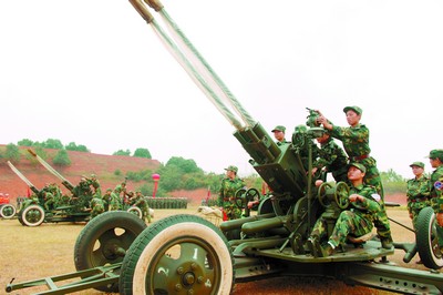 芙蓉區女子高炮分隊是會操現場一道亮麗的風景線。隨著一陣響亮整齊的口號聲,90名高炮分隊的女兵以最快速度將6臺高炮推進至戰斗位置。隨著指揮員“放列”的命令,各個女炮手迅速找準各自位置,打扛起螺桿,使火炮輪胎離地,行軍狀態的火炮立刻轉為戰斗狀態。緊接著,一炮手打動方向機,將火炮轉到指揮員所指方向,二炮手將火炮打到規定的射擊高度,三炮手裝上目標距離,四炮手裝上目標航速和航向,五、六炮手準備裝填炮彈。女兵們颯爽的英姿給大家留下了深刻的印象。(記者 彭瑋蔚 通訊員 付明 黃岡 周坤)