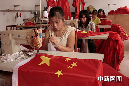 中新網石家莊9月26日電 (記者 徐艷輝 王穗)隨著國慶60周年日益臨近,全國各地的“紅妝”越來越濃,國旗也變得越來越搶手。25日,記者在河北省有名的“紅旗村”——藁城市梅花鎮屯頭村了解到,廠家不僅開足馬力生產,而且有的廠家通過空運,盡快將國旗發往全國各地。