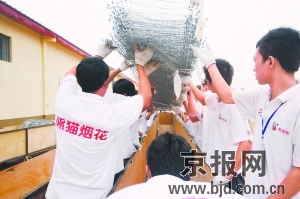 為了解決這個(gè)難題,熊貓煙花工作人員根據(jù)疊后網(wǎng)幕的規(guī)格,特制了一種10.5米×0.75米×0.8米的木箱。上車前,折疊好的網(wǎng)幕先入木箱。但整幅網(wǎng)幕焰火作品重達(dá)4至5噸,燃放現(xiàn)場(chǎng)需要6臺(tái)吊車才能吊起。即使切分為9小幅后,每一小幅的重量仍有450公斤,加上裝載折疊網(wǎng)幕的木箱,重量達(dá)到500公斤左右。