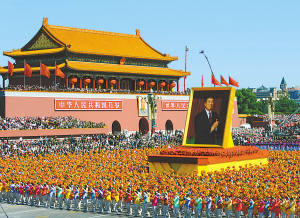 六十年前的“十一”,毛澤東在開國大典上向世界莊嚴宣告:“中華人民共和國,中央人民政府,今天成立了!”在新中國成立六十周年的慶典上,這聲音再次響徹天安門廣場。毛澤東巨幅畫像及“毛澤東思想萬歲”、“中國人民從此站起來了”兩句標語,出現在游行方陣中,似乎將人們帶回到六十年前新中國開國大典的振奮時刻。