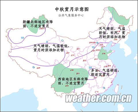 據目前的數據資料分析,明天我國大部地區以晴到多云的天氣為主,適宜賞月。西北地區大部、東北中南部等地天氣非常晴朗,不過夜間氣溫比較低,東北地區風還會比較大,賞月時應注意添衣保暖;華北中南部、長江中下游地區以及東南沿海地區天空云量將比最前兩天增多,以多云天氣為主,不過氣溫舒適,還能欣賞到“彩云追月”的朦朧美景。