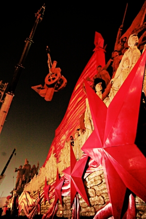 “浴血奮斗”彩車及“艱苦創(chuàng)業(yè)”彩車為整組彩車中最大的。長均為31米,高15米。昨天23時,50余名工人拆卸彩車。工人王艷俊在“艱苦創(chuàng)業(yè)”彩車前深鞠了三個躬!疤蝗菀琢!蓖跗G俊說,他們50多個工人陪伴兩輛彩車30多個日夜,他怕以后再也看不到這輛車。工人介紹,該彩車重50噸,需6輛大卡車運(yùn)離。由于彩車的浮雕、鋼架等大而沉重。最開始拆卸一次要一天時間!艾F(xiàn)在都熟悉了,6個小時保證拆完。”