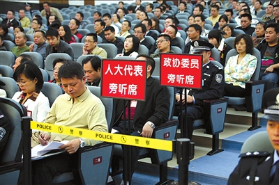 在一中院庭審現場,有20余名市人大代表和政協委員坐在旁聽席上,他們是專門受邀進行現場監督。據悉,起訴到各中院或上訴至市高院的重點“涉黑涉惡”案件的庭審均將邀請人大代表、政協委員現場監督。