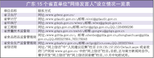 (廣東)省委辦公廳第二次網(wǎng)友集中反映問題交辦會要求首批設(shè)立“網(wǎng)絡(luò)發(fā)言人”的l5個省直單位,至昨天已全部設(shè)立“網(wǎng)絡(luò)發(fā)言人”,并開始履行職責(zé)。這標志著廣東在建立網(wǎng)絡(luò)發(fā)言人制度上邁出實質(zhì)性步伐。