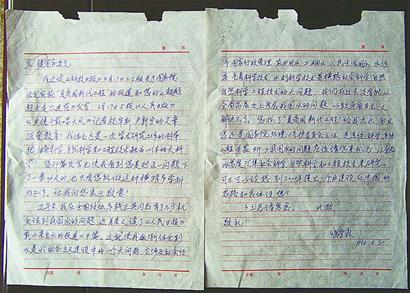 錢學森的這封親筆信共兩頁,圓珠筆書寫,落款時間是1996年6月30日,收信人是當時的國務委員宋健。收藏此信的文敏女士告訴記者,這封信是自己3年前在北京舊書市場上購買到的,當時一起買到的還有幾封名人信札。買回來后,起初也沒有很在意,但后來經(jīng)過閱讀,才覺出此信具有非常高的價值,便一直珍藏至今。從信中內容得知,錢老不光研究航天科學,對水的問題也很關心,并提出了很好的建議,而這方面以前很少有人提。現(xiàn)在,錢學森的去世讓所有中國人都感到惋惜和悲痛,這時把這封信公布出來,算是自己對老人表達的一份崇高敬意吧。
