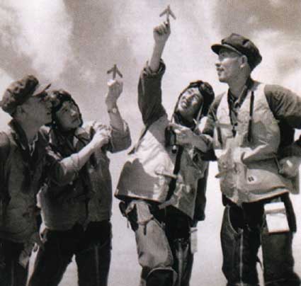 “01,敵F-4兩架侵入我國領空,已被我高炮部隊擊落一架,另一架正在你右前方二十五公里,繼續(xù)向我境內(nèi)飛行。航向一百六十度、高度二千米、速度一千公里,準備戰(zhàn)斗。”地面指揮員向飛行員發(fā)出了命令。宋義民立即指揮戰(zhàn)友調整空中戰(zhàn)斗隊形,組織搜索警戒。情況顯示板上、熒光屏上敵機的航跡在不斷地向我境內(nèi)延伸。突然,二號機趙廣江大聲報告“右前方發(fā)現(xiàn)一架敵機。”指揮員拿起話筒:“跟上去,狠狠打!”隨即一號機、三號機、四號機都發(fā)現(xiàn)了目標,在長機宋義民的指揮下,三架飛機加大油門一齊向敵機撲去。