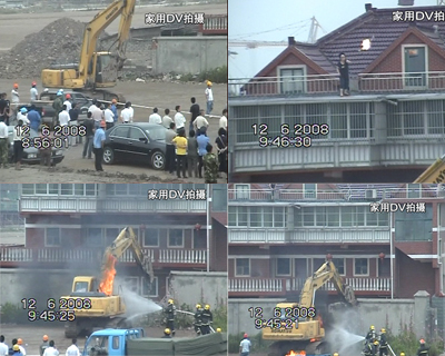 潘蓉站在頂樓的陽臺上,要求拆遷方提供法院文書。但是這個做法對于阻止強制拆遷的進行并不奏效。潘蓉和他的先生張其龍開始扔擲自制的汽油瓶。事實上,潘榮也知道,自己的這一做法已經觸犯了《治安管理條例》相關的條款。對于自己當初做出如此瘋狂而且不理性的舉動,潘榮坦言當時自己心里是非常害怕的。