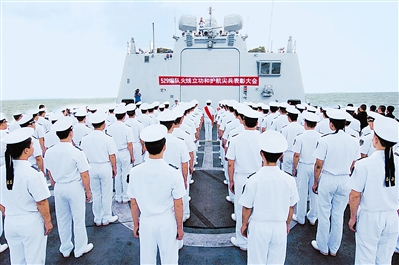 綬帶映紅碧波,掌聲響徹大洋。今天(當地時間11月25日)下午4時,中國海軍第三批護航編隊“火線立功和護航尖兵表彰大會”在“舟山”艦飛行甲板舉行。