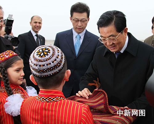 土庫曼斯坦政府官員和當地華僑華人趕到機場迎接。兩名土庫曼兒童分別向胡錦濤獻花和面包,請胡錦濤掰下兩小塊面包品嘗。