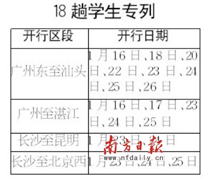 記者昨日從廣鐵集團有關部門獲悉,從1月16日起至26日,廣鐵集團將開行18趟學生專列,并采取多項舉措方便學生購票。