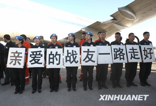 一場簡單而隆重的告別儀式在這里舉行。8名遇難人員的靈柩被安放在營區中央的兩輛重型卡車上,車前懸掛著他們的遺像。中國維和警察防暴隊和中國國際救援隊的隊員分列兩側,向戰友告別。