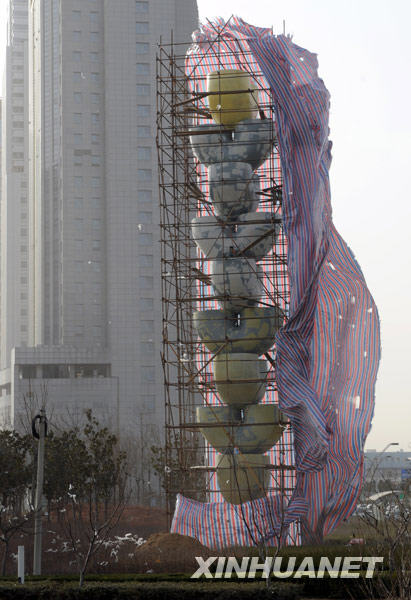 1月18日,記者在鄭州市鄭東新區如意河畔看到,20多米高的雕塑《金色的夢》仍被腳手架包裹著,九組“U”字形體疊加而成的麥穗造型的不銹鋼主體已完工,工人正在進行表面處理。鄭州市城市雕塑建設項目部證實,《金色的夢》是鄭州市政府投資200萬元建設的大型雕塑,以金色的茁壯的麥穗,意喻河南作為農業大省對我國糧食安全的重要貢獻。按照設計,將用5萬多張、重約1公斤的98%的金箔貼覆,金箔價值達22萬元。