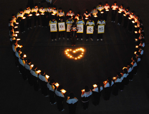 中新網九江一月二十日電 (胡國林)“我們在這里為你們點亮心燭,照耀你們前行的路,祝你們一路走好”,一月十九日晚七點半,在江西九江市晨光中學的操場上,綿陽班的學生郭鑫手捧蠟燭,眼含熱淚表示。當晚,五十余名綿陽班的學生點燃蠟燭為在海地地震中遇難的八名中國維和英雄和海地人民祈福。