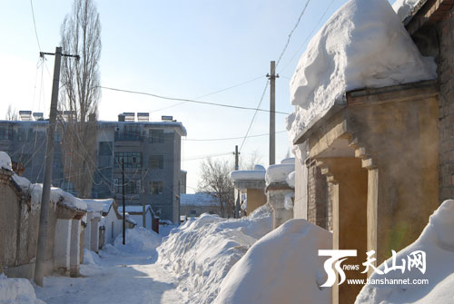 當記者來到城區背街小巷——杜別克街道倉房巷時看到,兩旁的積雪已與過往行人一樣高。間距不過10米的巷道,一半已讓積雪擋住了去路。