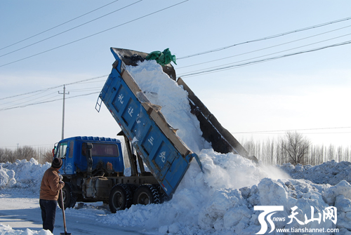 在塔城市,記者剛好碰到了一輛小四輪車裝滿了厚厚的雪向郊外倒雪點駛去。小四輪車從市中心的友好路、新華路,又穿過3條街道,行了約10公里,在位于城西的經濟開發合作區內停了車。