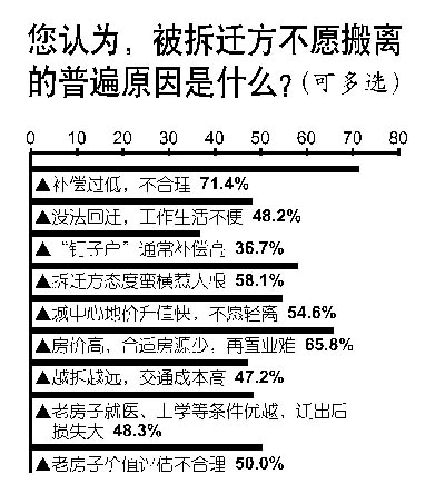 對于被拆遷方不愿搬離的普遍原因,此次調查中,71.4%的人首選“補償過低,不合理”;65.8%的人認為是“房價高,合適房源少,再置業難”;58.1%的人表示“拆遷方態度蠻橫惹人恨”。