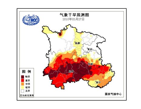 根據3月27日監測,云南大部、貴州西南部、廣西西北部、川西高原南部等地存在重度以上氣象干旱。
