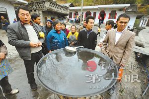 納雍縣少數(shù)民族眾多,這對新人都是漢族,新郎叫嚴(yán)大朵,新娘叫榮美翼。為了舉行婚禮,半個多月前,專門在新郎家門口修了一個水池。全家人都省吃儉用,到處找水存進(jìn)這水池當(dāng)中,村子里其他鄉(xiāng)親也來幫忙。到婚禮舉辦的前一天,兩米見方的水池終于全部裝滿。家里又找了幾口大鐵鍋,裝滿清水備用。