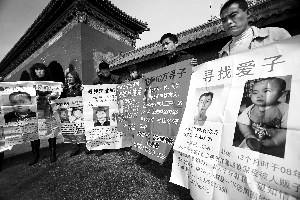 昨日下午2時許,天壇公園西門附近,10位尋找自己“走失”孩子的父母,舉著大幅的海報,在向過往的市民介紹著孩子失蹤的情況。海報上,一張張稚嫩活潑的孩子的面孔與這些中年人憔悴的神情形成了鮮明的反差。