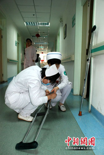 中新網(wǎng)4月12日電( 楊麗紅)近日,在山醫(yī)大一院綜合科病區(qū)接受治療的王家?guī)X獲救工友經(jīng)下肢靜脈B超檢查以及凝血時間生化等檢查后,各項指標顯示無異常,可以由護士陪同,慢慢下地活動了。這是為了預防長期臥床的傷員發(fā)生下肢靜脈血栓。