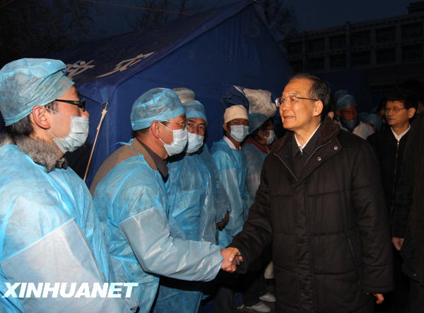 晚上8點40分,溫家寶在國務院抗震救災總指揮部的臨時帳篷里主持召開會議,聽取玉樹抗震救災情況的匯報并作了重要指示。會議結束時已經過了23時,溫家寶又步行道體育場群眾安置點看望群眾。