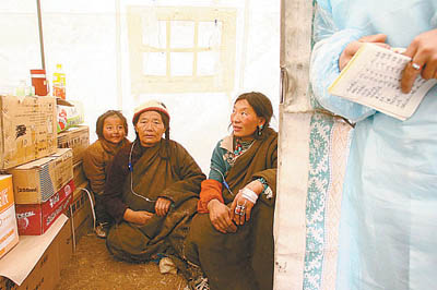 帳篷里還住著為了救人而精疲力盡的士兵、工人和志愿者,他們從全國各個省份來到這里,忍受著海拔4000多米高原上的缺氧和寒冷,把老人、孩子和傷殘者送上汽車、抬上擔架,有時,一不小心就會留下傷痕。他們許多人每天至少要工作15個小時,現在剛剛一身疲憊地回到營地,盤算著明天的任務。