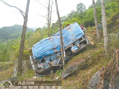 李朝蘇、李廷軒是叔侄,當天上午8時許,他們在大化板升鄉坐上這輛車,準備前往南丹打工。事發后,他們倆最先逃出車外且受傷最輕。李廷軒說:“上車后,我坐在發動機蓋上。在經過干來村時,司機突然大喊一聲‘失靈了’,接著車子就沖下了懸崖。”李朝蘇說,班車沖下懸崖后,樹枝把車擋風玻璃撞碎,他和侄子便被從車內拋了出來。幸運的是,兩人只受了些皮外傷。據他們介紹,事發時車上的座位已經全部坐滿,還有不少乘客是站著的。